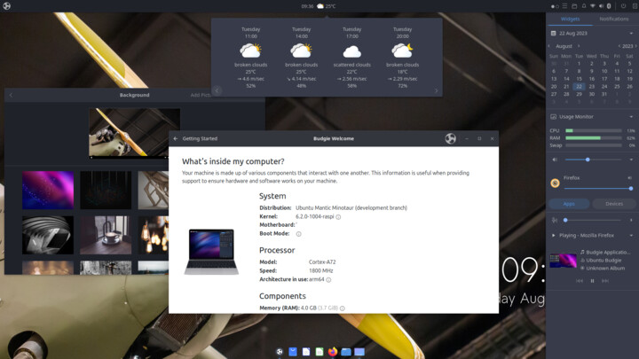 Main ScreenQuickNote appletKeyboard and Monitor lightning appletRaven look in different themesNew InstallerSlick Greeter now allows toggling password visibilityPower Settings Classic MenuOrchid ThemeSystem overviewARM TweakToolQuick action accessHotcorner settingsRaven clock appletWeather applet light themeWeather applet dark themeHotcorner activationBudgie SettingsScreenshoot appletScreenshoot applet image settingsThemes & LayoutsBudgie ARM Tweak ToolBudgie WelcomeBudgie Gaming – Gaming Tools Budgie ExtrasExtended menuBudgie SettingsHotcornersShuffler applet FullscreenmenuBackupExtended menu 2